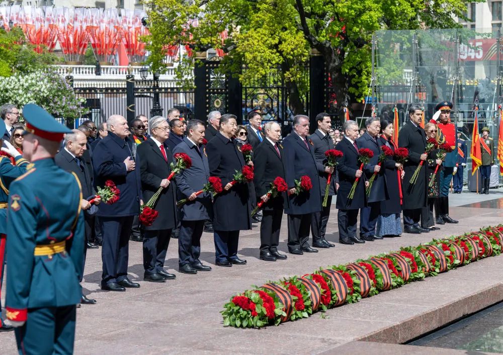習近平主席同其他國家領導人一起從紅場來到亞歷山大花園,向無名烈士墓獻花,并肅立默哀