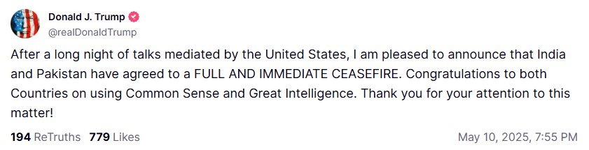 美國總統特朗普在社交媒體上宣布,在美國的斡旋下,經過一個漫長的夜晚,“我很高興地宣布,印度和巴基斯坦已經同意立即全面?;稹?。他還寫道:“祝賀兩國運用常識和大智慧。感謝您對此事的關注!”