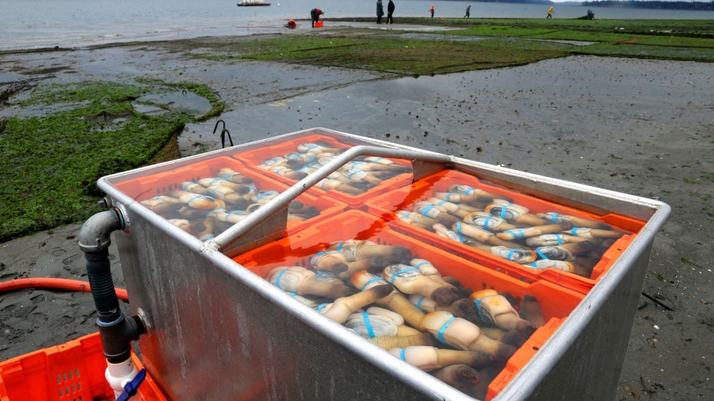 象拔蚌被捕獲后保存在海水中,然后運往華盛頓州哈斯汀島附近的養殖場。 美聯社