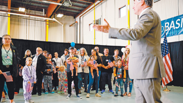 ▲圖為美國副國務卿蘭道(右)12日在杜勒斯國際機場,歡迎首批59名南非白人難民抵達美