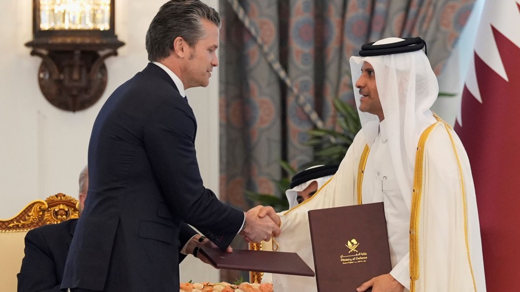 ▲美國與卡塔爾國防部長簽署國防協議后握手。 美聯社