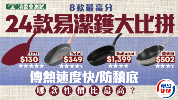 不少人在家中煮食都會用到易潔鍋,消費者委員會(消委會)今日(5月15日)發表易潔鍋檢測結果,消委會測試市面24款易潔鍋樣本,包括IKEA、Tefal、Ballarini、意美廚等品牌的易潔鍋產品。結果消委會發現,樣本間的傳熱速度參差,傳熱速度最慢的易潔鍋樣本甚至需時接近16分鐘。不過,亦有8款易潔鍋樣本總評獲5星,售價由$130至$1,750不等,反映無論平貴都有好選擇,到底哪款僅售$130的易潔鍋,仍獲消委會5星好評?