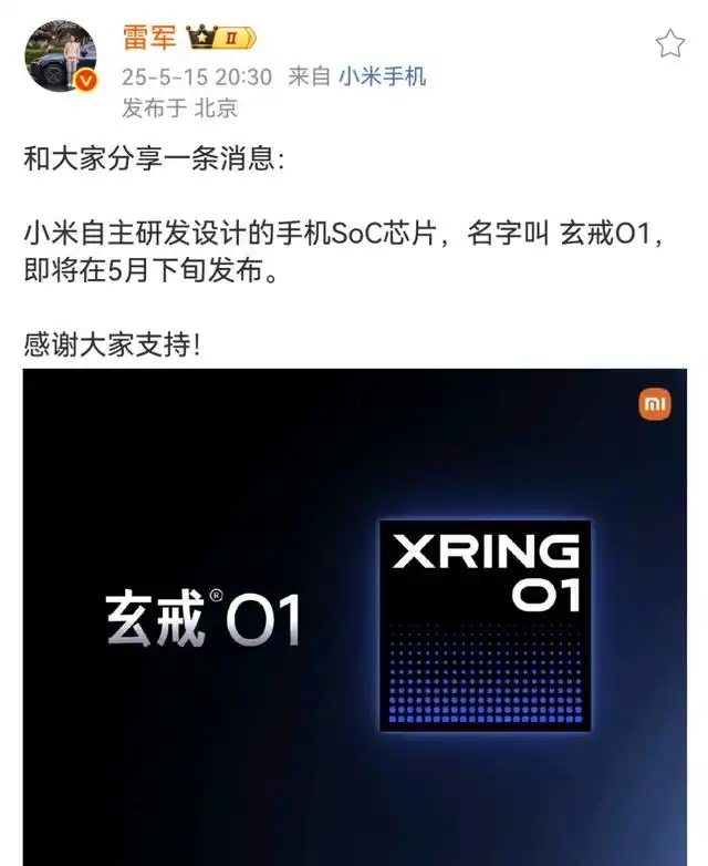 5月15日晚間,雷軍發布微博稱,小米自主研發設計的手機SoC芯片,命名為“玄戒O1”,即將在5月下旬發布。此外,15日有多位網友在社交平臺分享雷軍演講,在演講中雷軍首次談到近期小米SU7事故引發的輿論危機。