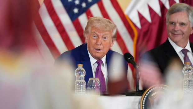 ▲美國總統特朗普(Donald Trump)于2025年5月15日(星期四)在卡達多哈出席商業圓桌會議期間比手勢。(圖/美聯社)