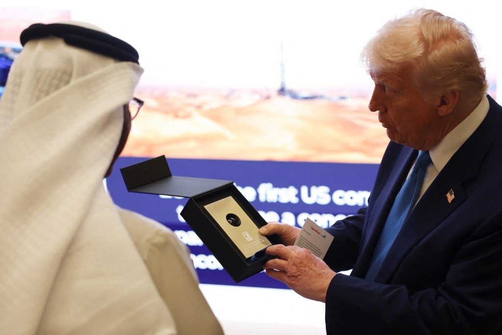 地時間5月16日,特朗普在阿聯酋展示他收到的來自該國的禮物——一滴石油。
