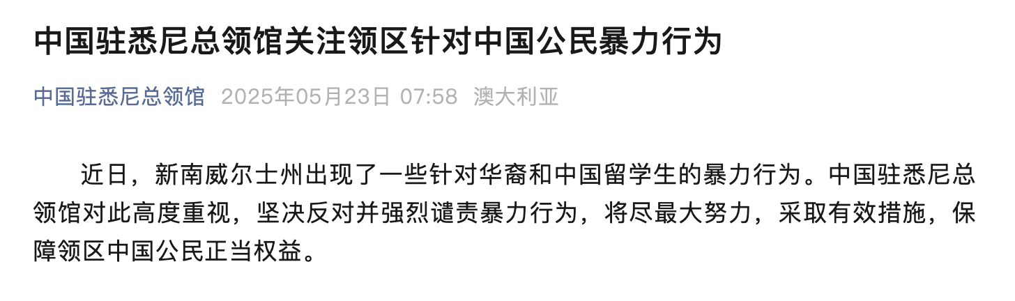 中國駐悉尼總領館今日(23日)發布消息指,近日,新南威爾士州出現一些針對華裔和中國留學生的暴力行為。中國駐悉尼總領館對此高度重視,堅決反對并強烈譴責暴力行為,將盡最大努力,采取有效措施,保障領區中國公民正當權益。澳大利亞出現針對中國公民的暴力行為,中方強烈譴責
