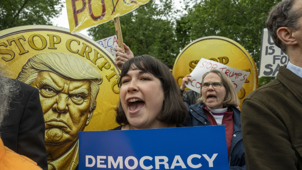 路透社報道,賓客魚貫進入活動現場,特朗普乘坐“海軍陸戰隊一號”(Marine One)直升機抵達時,“特朗普國家高球俱樂部”(Trump National Golf Club)外停車場沿街聚集上百名抗議群眾,手持標語包括“美國是非賣品”、“停止加密貨幣腐敗”和“公布賓客名單”等。