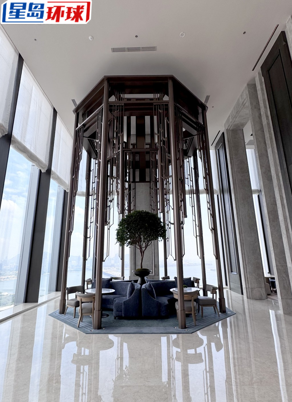 空中大堂特設落地大玻璃,讓住客可高高在上俯瞰深圳灣無敵海景與城市天際線,更是黃昏時份欣賞日落美景的好地方。旁邊亦有座以黃銅打造的獨立青銅亭閣(The Pavilion),Pavilion無論在東方或西方都有著“人與人之間相聚”之意,設計師特意借這結構來表達深圳是個“文化交匯的地標”。而每日日暮時份,St. Regis百年傳統“馬刀開香檳”入夜儀式,亦會在這里舉行。