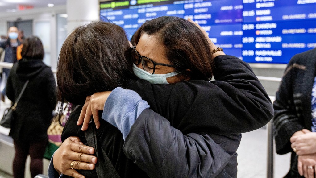 ▲飛抵多倫多的港人與親友激動相擁。 路透社