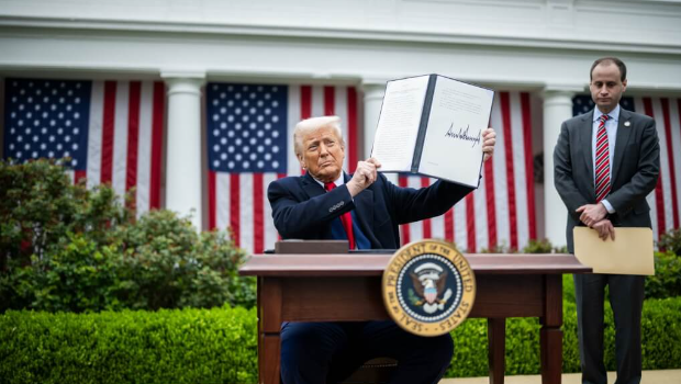 ▲圖為美國總統特朗普(中)4月2日宣布對各國開征對等關稅。(圖取自x.com/WhiteHouse)