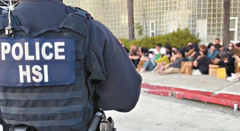 一段由洛杉磯國土安全調查局分享的影片顯示,天未亮時,一名探員在停車場穿上執勤背心,接著畫面切換至日間,一群人擠在一棟建筑物外的人行道上,正被拘留,其中一些人低著頭。