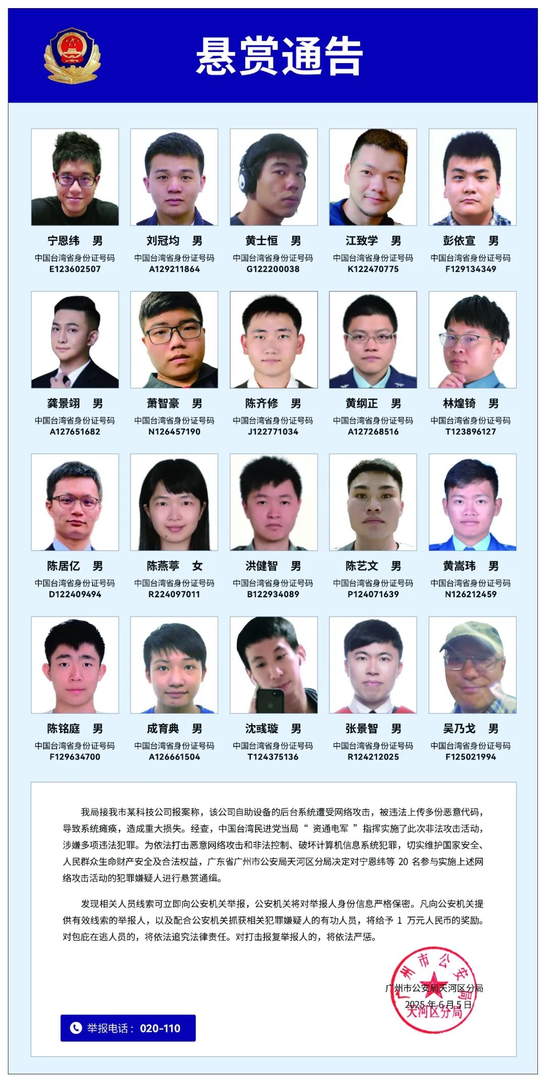 5日,廣州市公安局天河區分局發布《懸賞通告》,對20名來自臺灣參與實施網絡攻擊活動的重要犯罪嫌疑人進行懸賞通緝。這是公安機關首次通過執法行動對“臺獨”分裂勢力亮劍,首次對臺灣“資通電軍”有組織網絡違法犯罪行為的集中打擊,一舉查實20名犯罪嫌疑人真實身份,全面固定犯罪證據并公開懸賞通緝。