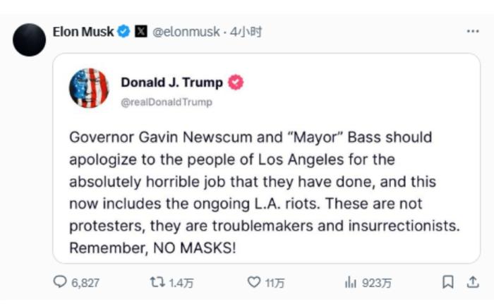 隨后,馬斯克還轉發了多條特朗普在其自創社交平臺上發布的有關“洛杉磯騷亂”的帖文和截圖。有分析稱,這表示了馬斯克在該事件中對美國聯邦政府的聲援。