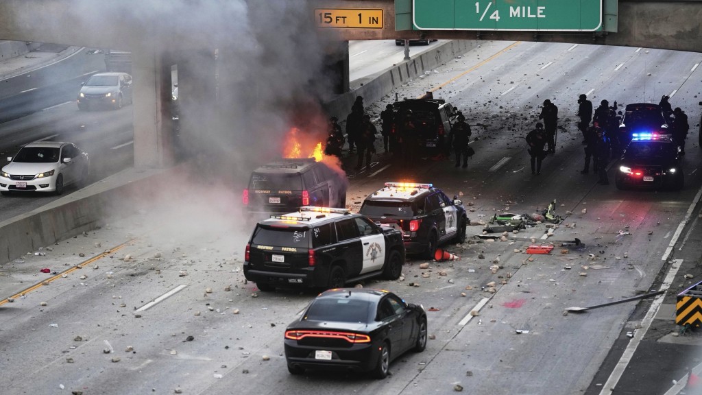 ▲洛杉磯市中心大都會拘留中心附近的101號高速公路上,示威者向公路巡邏車隊擲石點火。 美聯社