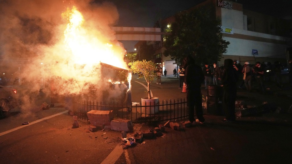 ▲洛杉磯市中心大都會拘留中心附近一個垃圾箱被點燃。 美聯社