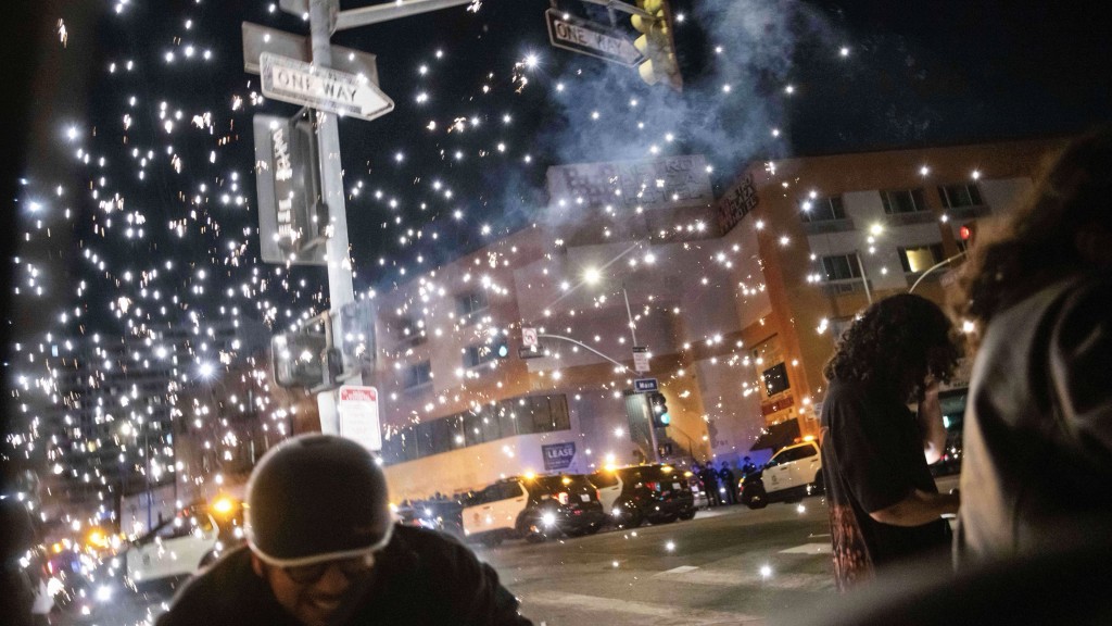 ▲洛杉磯示威現場煙花如雨落下。 美聯社