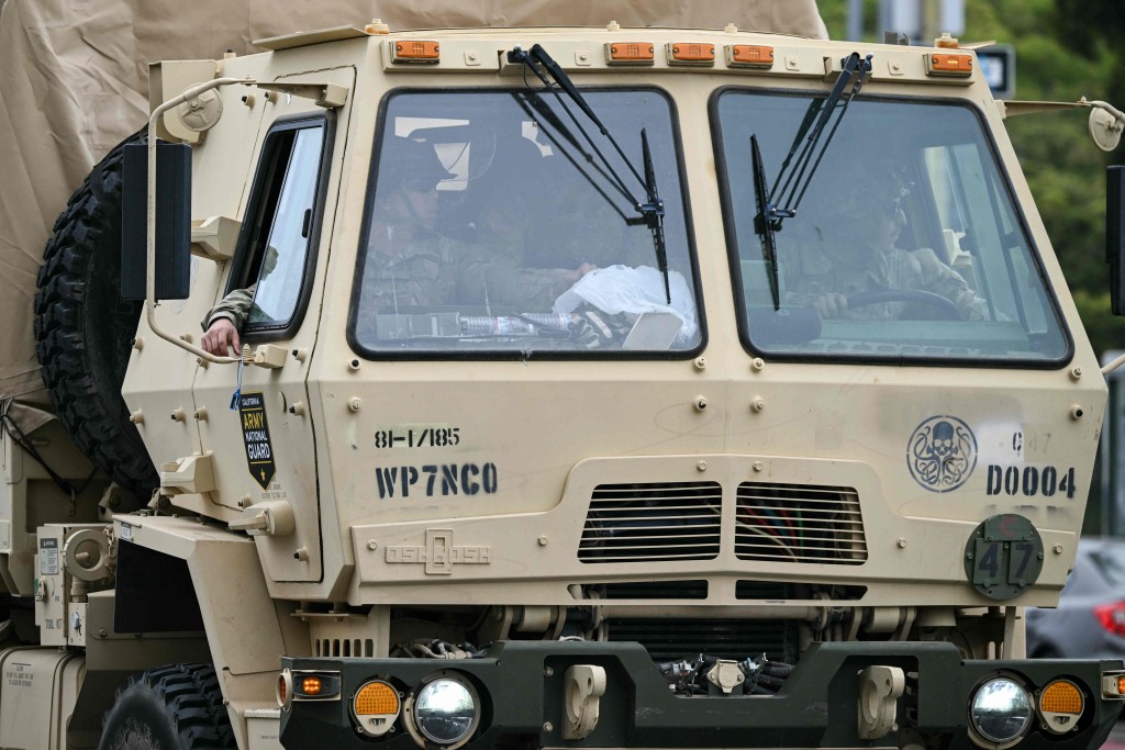 國民警衛隊車輛在洛杉磯市中心部署。 法新社