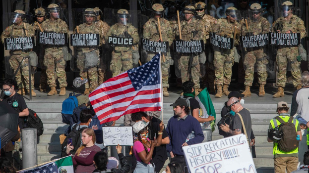 針對特朗普下令增派2000名國民警衛隊進駐洛杉磯,激發數百名群眾在洛杉磯的聯邦政府大樓前聚集。大批警力與加州國民警衛隊駐守大樓周邊,與抗議群眾形成對峙場面。