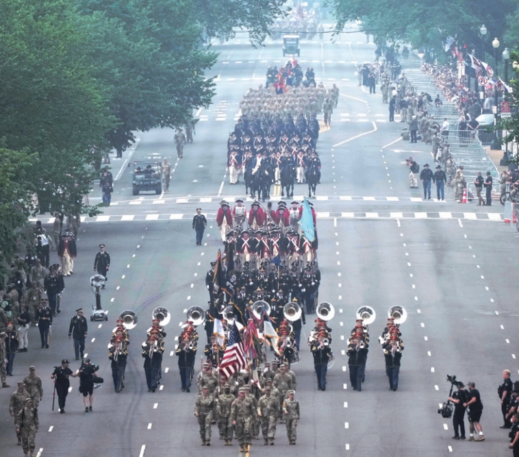 由于華盛頓天氣不穩,傍晚開始飄雨,閱兵儀式較原定時間提早約半小時開始,大批民眾到憲法大道一帶聚集觀看。綜合美聯社、路透社等媒體報道,總統特朗普和夫人梅拉尼亞、副總統萬斯等一眾官員和國會議員都到場,在白宮南面的特別看臺觀看閱兵,陸軍鳴響21發禮炮。