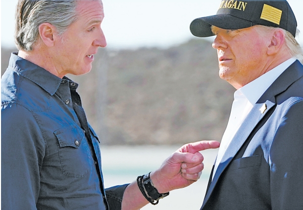 ▲紐森與特朗普今年1月在洛杉磯機場交談。美聯社資料圖