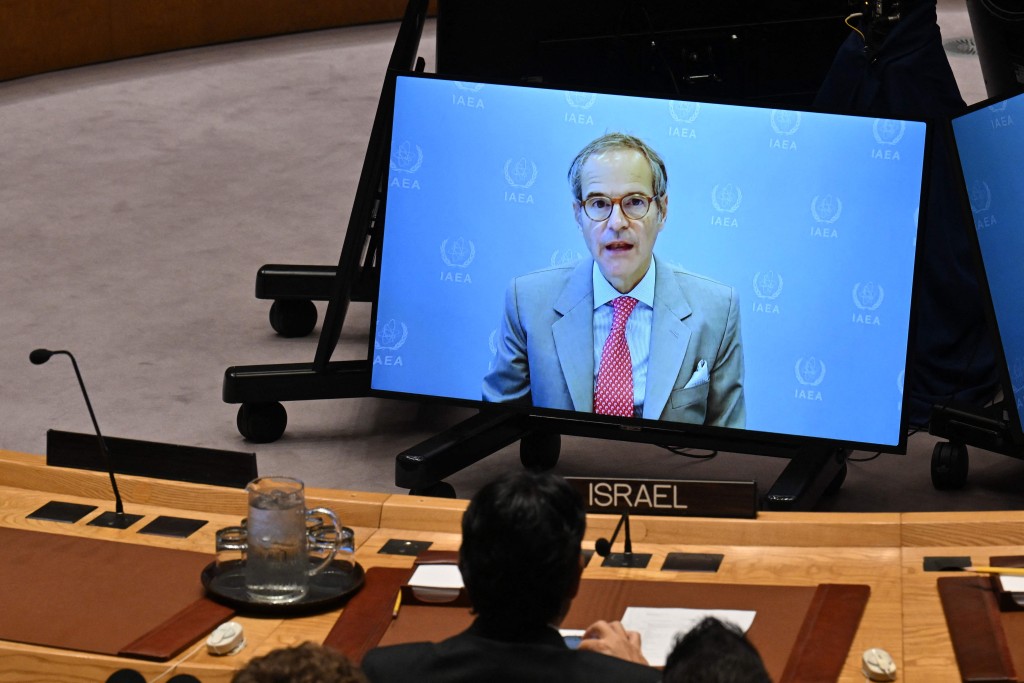 ▲格羅西在聯合國安理會中東局勢緊急公開會上作視頻發言。法新社