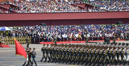 三軍儀仗隊后,10個英模部隊方隊,按照八路軍、新四軍、東北抗聯、華南游擊隊4個模塊編組走過天安門廣場。