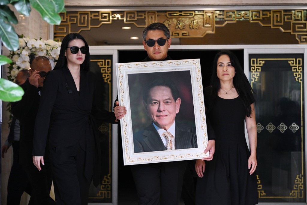 【12:19】何正德在太太林恬兒、姐姐何詩曼陪同下,捧著父親遺照步出殯儀館。