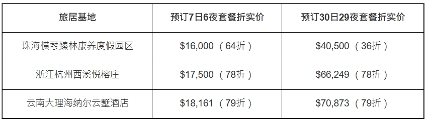 以入住杭州西溪悅榕莊為例,有7日6夜或30日29夜兩款旅居套餐選擇,會員均享78折價格優惠。 若預訂7日旅居套餐的折實價為17,550元,較原價平4950元; 若預訂30日旅居套餐的折實價則為66,249元,較原價平18,685元。 套餐服務包了雙人早餐,以及水療、參與八段錦活動、旅拍等六養服務。