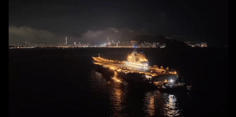 ▲山東艦的甲板燈火通明璀璨,緩緩駛向維港兩岸,畫面和諧優美。
