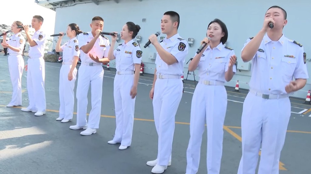 ▲艦上有多名海軍官兵即場獻唱《我和我的祖國》等歌曲。