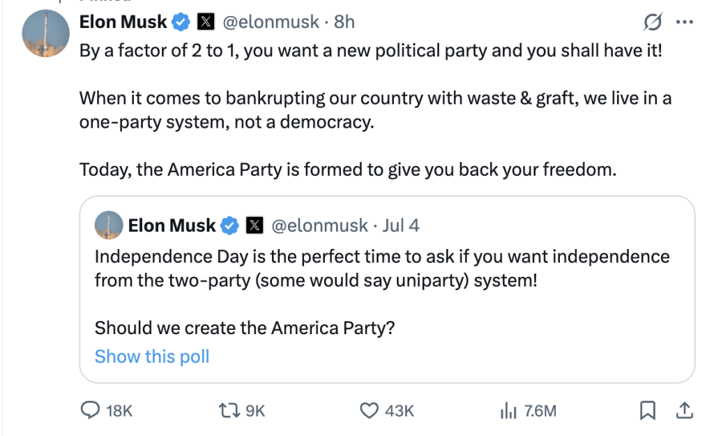 馬斯克周六晚上在社交平臺X上稱:“如果你們想要一個新的政黨,你們的比例是二比一,你們就應該擁有它!”他說:“當浪費與貪污讓國家破產時,我們生活在一黨制,而不是民主國家?!彼m說:“今天,美國黨正式成立,要將你們的自由還給你們!”
