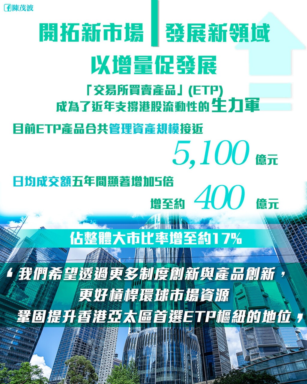 陳茂波又提到,港交所正積極推動更多不同主題的ETF上市,包括創新科技、應對氣候變化、可再生能源以及生物科技等,在滿足投資者興趣和風險胃納的同時,也將更有效引導資金流向推動實體經濟更高質量發展。希望透過更多制度創新與產品創新,更好杠桿環球市場資源,鞏固提升香港亞太區首選ETP樞紐的地位。同時亦會加強向海外市場推介香港金融市場的工作,讓海外投資者更充份了解及聚焦香港的優勢、發展機遇與潛力。