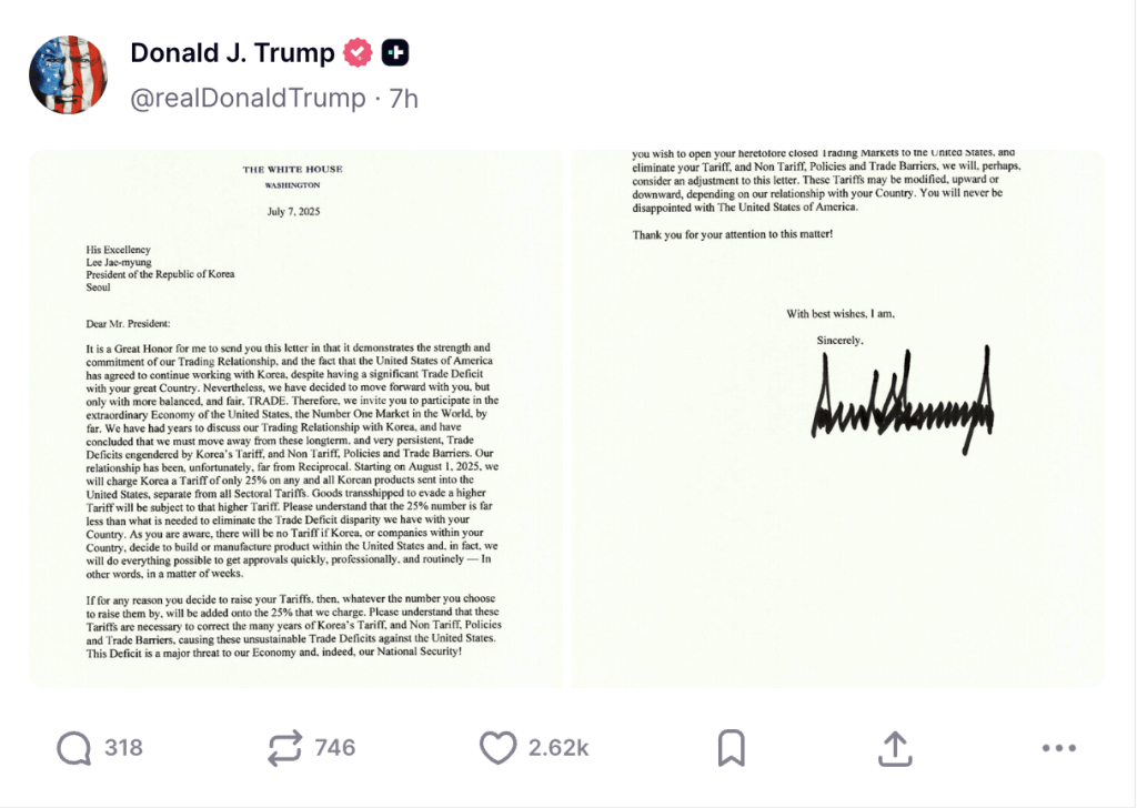 • 特朗普宣布對日本韓國征收25%關稅,若報復將再提高關稅