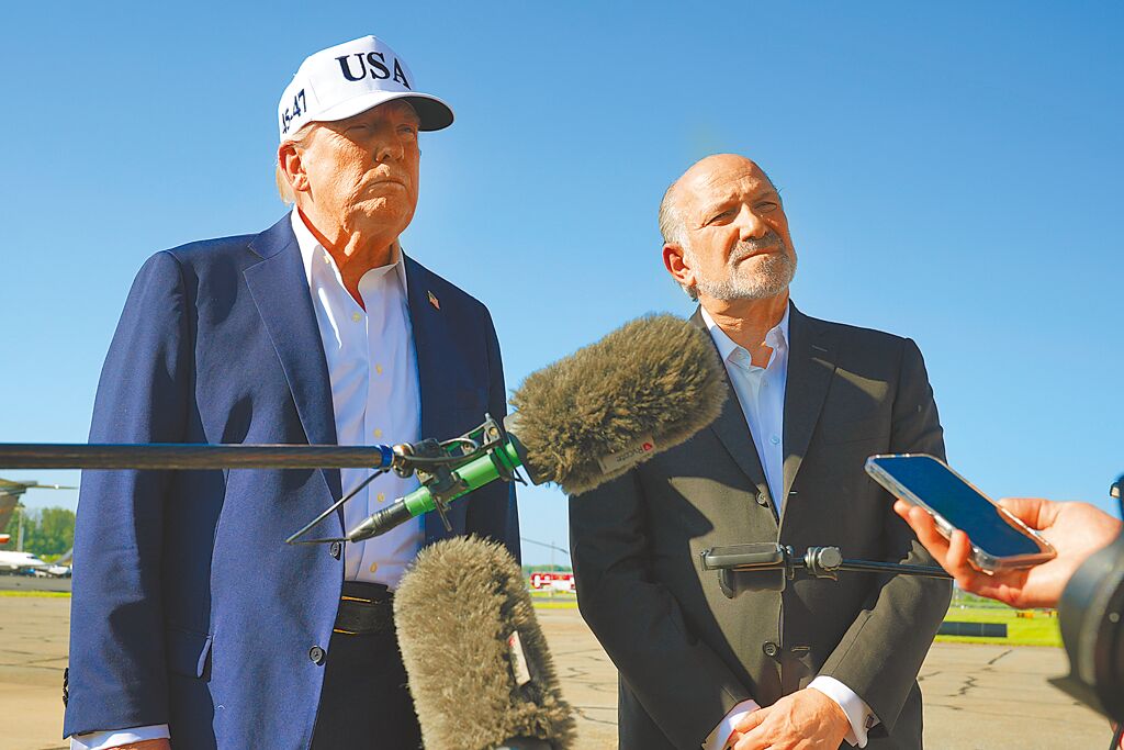 圖為特朗普(左)當地時間6日在紐澤西州莫里斯敦與商務部長盧特尼克就關稅談判議題受訪。(美聯社)