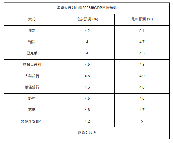 中國第二季經濟增長好于市場預期后,據彭博統計至少有9間美資及國際銀行上調今年中國經濟增長預測,包括摩根士丹利、高盛和巴克萊等機構將中國今年GDP增速預測上調至近5%,澳新銀行則將增速預測上調至5.1%。