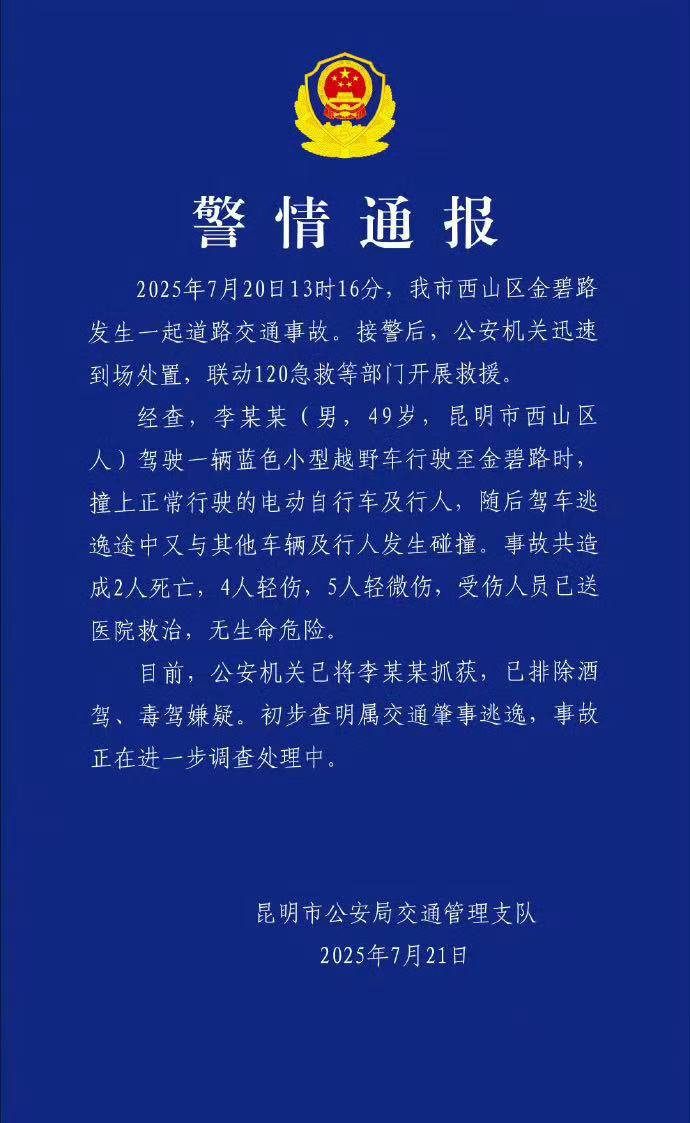 經查,李某某(男,49歲,昆明市西山區人)駕駛一輛藍色小型越野車行駛至金碧路時,撞上正常行駛的電動自行車及行人,隨后駕車逃逸途中又與其他車輛及行人發生碰撞。事故共造成2人死亡,4人輕傷,5人輕微傷,受傷人員已送醫院救治,無生命危險。