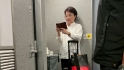 ▲臺中市長盧秀燕20日深夜搭上高鐵自由座,因當時已無座位,她便自行推著行李獨自站在車廂角落。(讀者提供)