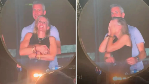 ▲當地時間16日,安迪·拜倫與卡伯特在“酷玩樂隊”演唱會上親密摟抱。圖自外媒