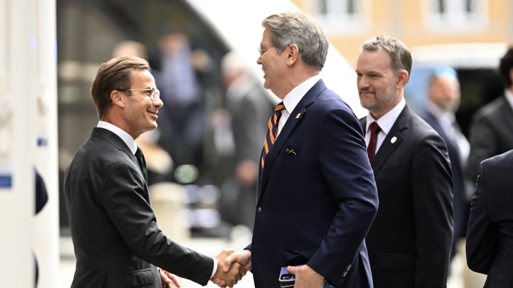 ▲瑞典總理克里斯特松(左)迎接美國財政部長貝森特(中)和美國貿易代表格里爾(右)。 路透社