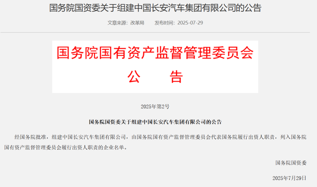 同時,國務院國資委發布公告,經國務院批準,組建中國長安汽車集團有限公司,列入國務院國有資產監督管理委員會履行出資人職責的企業名單。