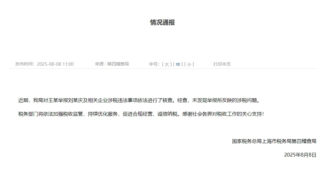 演員劉曉慶日前被深圳市民王先生實名舉報涉嫌偷稅漏稅問題引發廣泛關注。8月8日,國家稅務總局上海市稅務局發布情況通報:近期,該局對王某舉報劉某慶及相關企業涉稅違法事項依法進行了核查。經查,未發現舉報所反映的涉稅問題。稅務部門將依法加強稅收監管,持續優化服務,促進合規經營、誠信納稅。