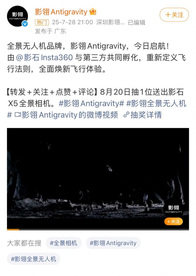 而影石科技與第三方共同孵化的全景無人機品牌影翎Antigravity近期也在微博發布宣傳片宣告“出道”,并將在8月開啟共創公測。目前,社交媒體中已流傳出印有“Insta360”字樣的無人機照片,照片中無人機上貼著和汽車上市前路跑一樣的迷彩偽裝。