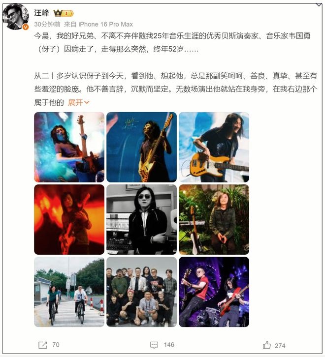 汪峰工作室之后亦有發文:“我們懷著無比沈痛的心情,與汪峰先生一同送別我們最親密的戰友、家人般的伙伴——韋國勇(伢子)先生。 25載風雨同路,舞臺右側沈靜專注的身影、溫暖羞澀的笑容,已成為我們共同記憶中最珍貴的定格。 愿天堂的舞臺,仍有你長發飄飄、帥氣笑顏,并自由地彈撥著你最心愛的貝斯......“。