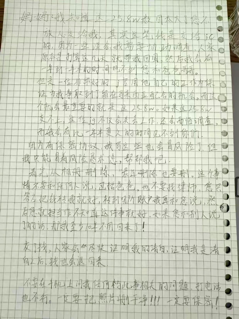 發給母親隨即撤回的“手寫文字”中,小文表示,“如果這25.8萬交不上,這位警官不僅會失去工作,還會面臨調查,而我會有比一年半更久的時間見不到你們......交了錢,人家會盡快證明我的清白,證明我是清白之后,我也會(把錢)退回來......”