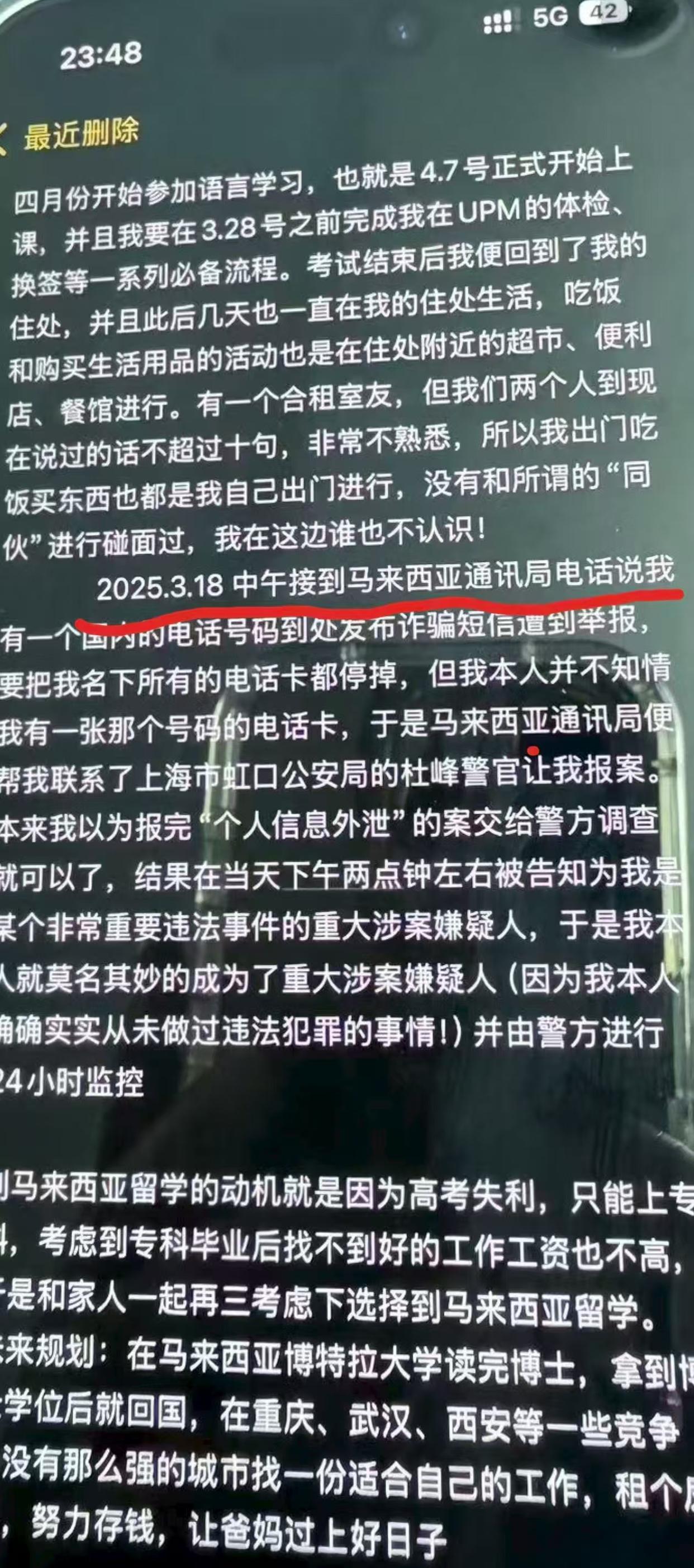 “自白書”還陳述了她接到“上海警察”電話的經過:“2025.3.18中午接到馬來西亞通訊局電話說我有一個國內的電話號碼到處發布詐騙短信遭到舉報,要把我名下所有的電話卡停掉,但我本人并不知情我有一張那個號碼的電話卡,于是馬來西亞通訊局便幫我聯系了上海市的杜警官讓我報案。本來我以為報完‘個人信息外泄’的案交給警方調查就可以了,結果在當天下午兩點鐘左右被告知我是某個非常重要違法事件的重大涉案嫌疑人,于是我本人就莫名其妙成為了重大涉案嫌疑人(因為我本人確確實實從未做過違法犯罪的事情?。┎⒂删竭M行24小時監控......”