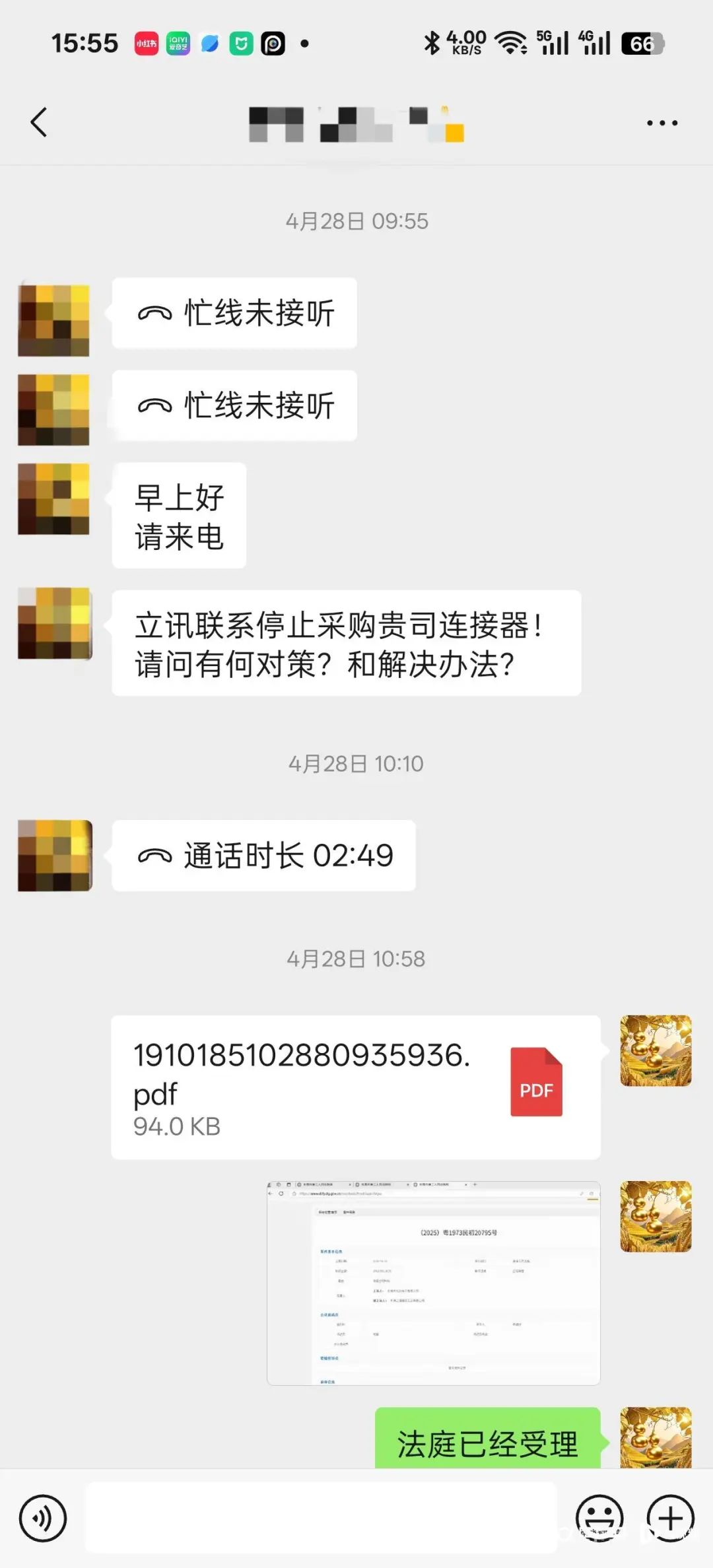 在多次溝通無果后,李全稱收到了來自立訊相關方采購負責人的聯絡,其中的一句話讓他至今印象深刻:“立訊的律師團隊隨時為了捍衛立訊的利益而戰?!?/span>