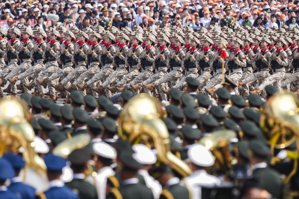 一眾受閱方隊中,其中兵方隊全部由女民兵組成。這是女民兵方隊首次亮相以紀念抗戰勝利為主題的閱兵活動。