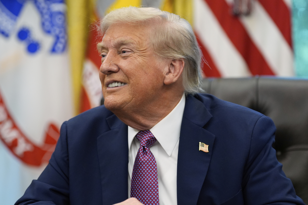 ▲美國總統特朗普5日在白宮橢圓形辦公室面對媒體時露出笑容。(美聯社)