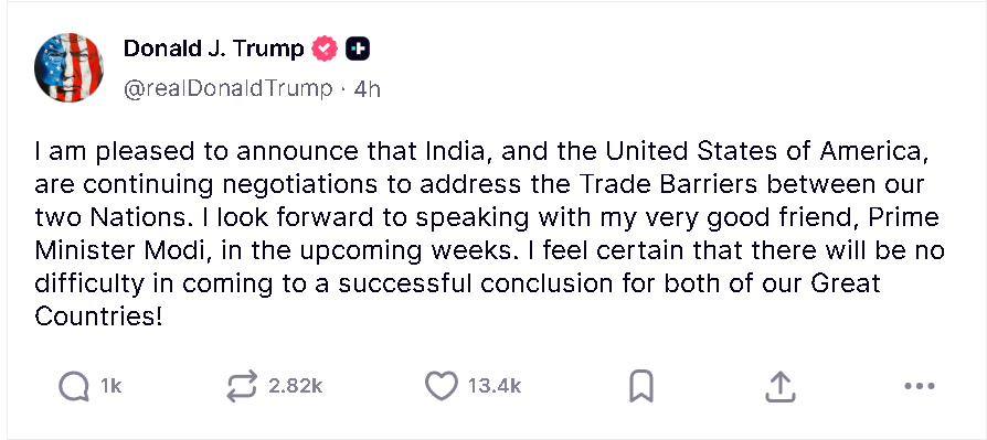此外,特朗普在周二發布的一則帖文中表示,美國與印度的貿易談判正在進行中。他還說自己將在幾周內與印度總理莫迪見面。