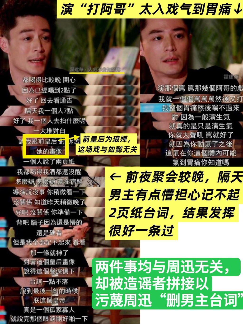 此外,關于周迅和霍建華之間的傳聞,有人稱“霍建華控訴周迅在片場臨時改他的劇本,把他氣到胃疼”,事實是霍建華受訪時說拍攝“乾隆于前皇后葬禮上打罵兩個阿哥”這場戲氣到胃痛;周迅也無權改霍建華劇本,更無“霍建華被周迅欺凌得苦不堪言,在采訪里提到如懿的悲慘結局就高興得眉開眼笑”荒謬傳聞。